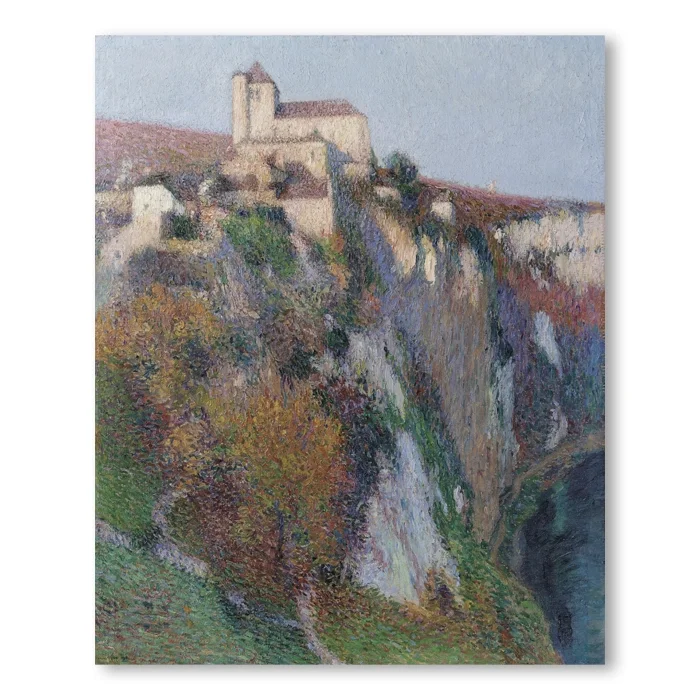 L’eglise Saint-Cirq Lapopie percheé sur la falaise de la boucle de Lot, ciel bleu.