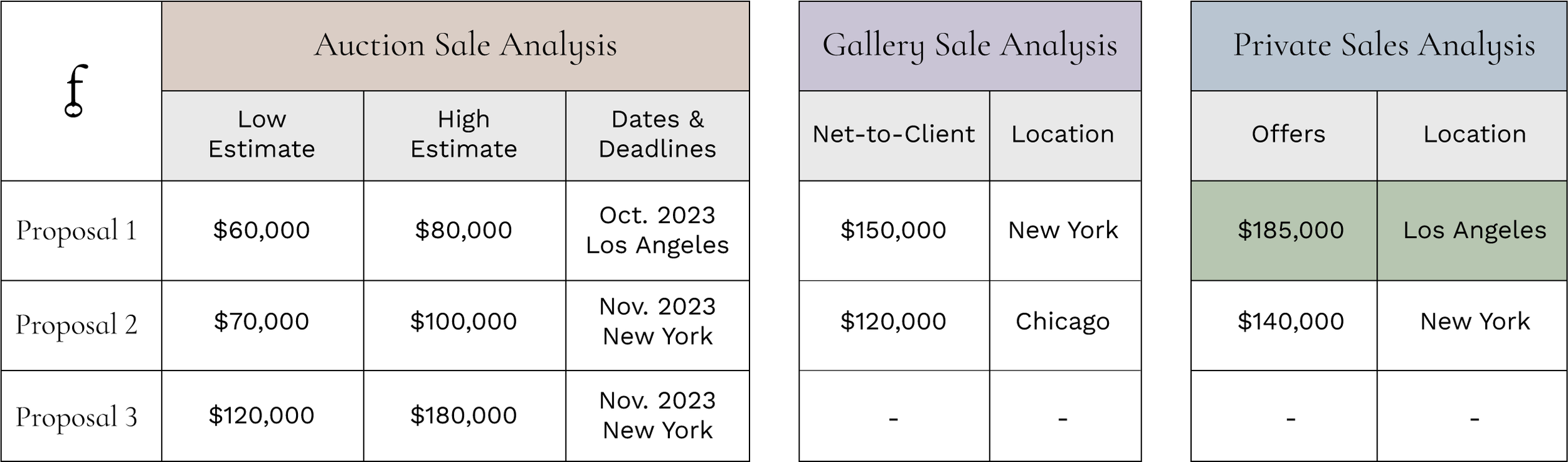 Comprehensive research-based selling plans that analyze auction, private sale and gallery options.